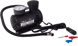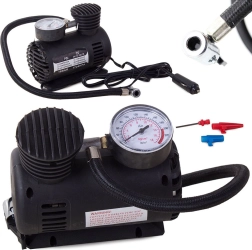 Balenie obsahuje kompresor s hadicou, zástrčku do zapaľovača, tlakomer a sadu koncoviek pre rôzne potreby.