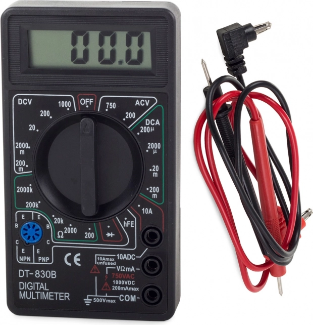 Univerzálny digitálny multimeter s LCD displejom na rýchle a presné meranie v dielni aj doma. Zvláda DC/AC napätie až 1000 V/750 V, prúd do 10 A a odpor do 200 MΩ, ponúka test diód a hFE tranzistorov, má automatické vypnutie a spĺňa bezpečnostné požiadavky IEC-1010 (CAT II/CAT III).