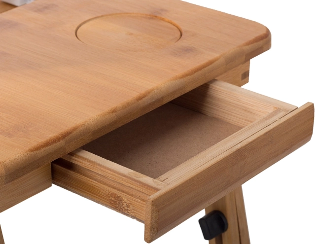 Stolík má praktickú vysúvaciu zásuvku na uloženie drobných predmetov, čo uľahčuje organizáciu vašich pracovných pomôcok. Dve výrezy v hornej doske umožňujú efektívne odvádzanie prebytočného tepla a zabezpečujú hladký chod notebooku. Je tiež vybavený miestom pre šálku alebo plechovku s nápojom.