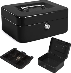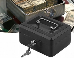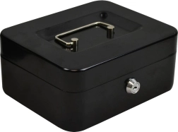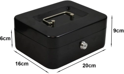 Kompaktná kovová pokladničná schránka na bezpečné uloženie peňazí, kľúčov a dokumentov. Je vyrobená z lisovaného oceľového plechu, má zámok na kľúč (2 kľúče v balení), vyberateľnú vložku s 5 priehradkami a pevnú zapustenú rukoväť na jednoduché prenášanie aj stohovanie. Rozmery 20 × 16 × 9 cm, elegantná čierna farba.