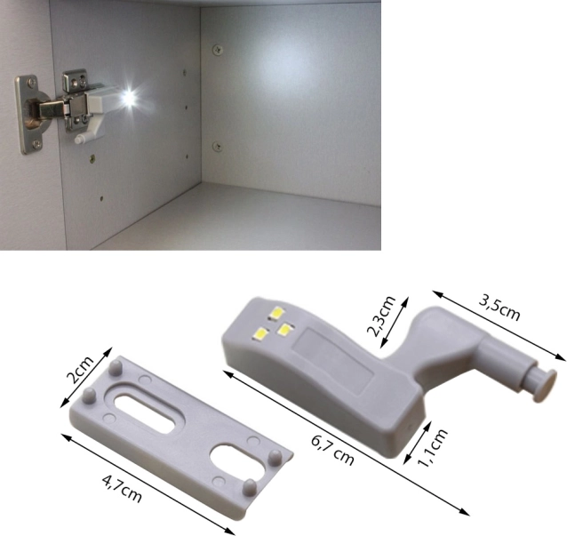 Praktické svetlo na pánt skrine s 3 LED diódami sa automaticky rozsvieti pri otvorení dverí a pri zatvorení zhasne. Vďaka univerzálnej montáži pasuje na väčšinu pántov, poskytuje jasné studené svetlo a pomôže rýchlo nájsť veci aj v ztmavených skriniach. Jednoduchá inštalácia jedným skrutkou.