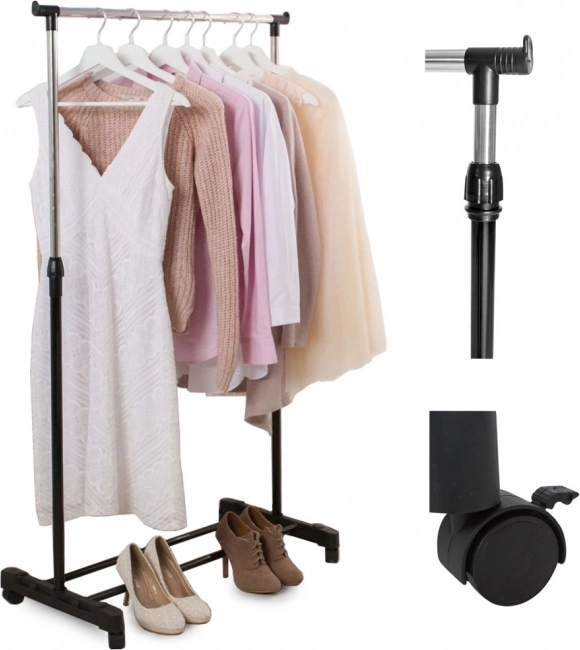 Teleskopický šatníkový vešiak na kolieskach je univerzálne riešenie pre organizáciu oblečenia v domácnosti, kancelárii, obchode alebo kaderníctve.