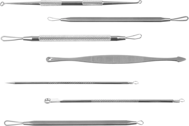 Tip na použitie: Pred zákrokom očistite a zohrejte pleť (napr. teplým obkladom). Umiestnite vhodnú slučku nad komedón, jemne zatlačte a vytlačte nečistotu smerom nahor. Po skončení ošetrite pleť antiseptikom a nástroje vydezinfikujte.