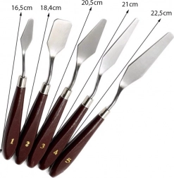 Kompletná sada piatich špachtlí pokrýva miešanie na palete, nanášanie hrubších vrstiev farby aj vytváranie reliéfnych efektov a presných hrán.