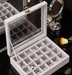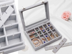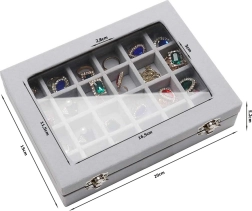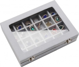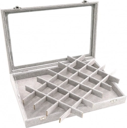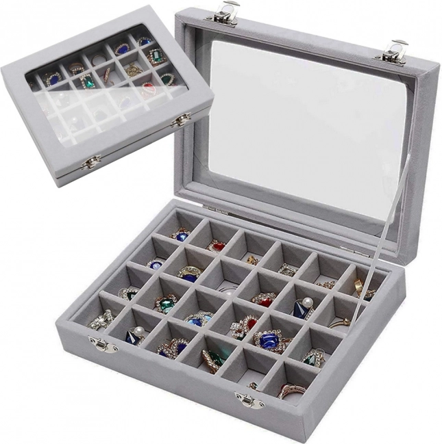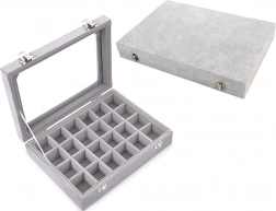 Elegantná šperkovnica z mäkkého semišu s 24 priehradkami bezpečne uloží prstene, náušnice, retiazky aj náramky. Vďaka sklenenému veku máte prehľad o obsahu, zatiaľ čo dve kovové spony zabezpečia spoľahlivé uzavretie. Štýlový, funkčný a objemný organizér ideálny domov aj do vitrín na prezentáciu šperkov.