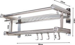 Elegantná závesná kúpeľňová polica v striebornej farbe kombinuje priestrannú odkladaciu plochu, dve tyče na uteráky a štyri praktické háčiky. Ľahká a odolná hliníková konštrukcia je ideálna na každodenné používanie a vďaka univerzálnemu dizajnu zapadne do moderných aj klasických interiérov.