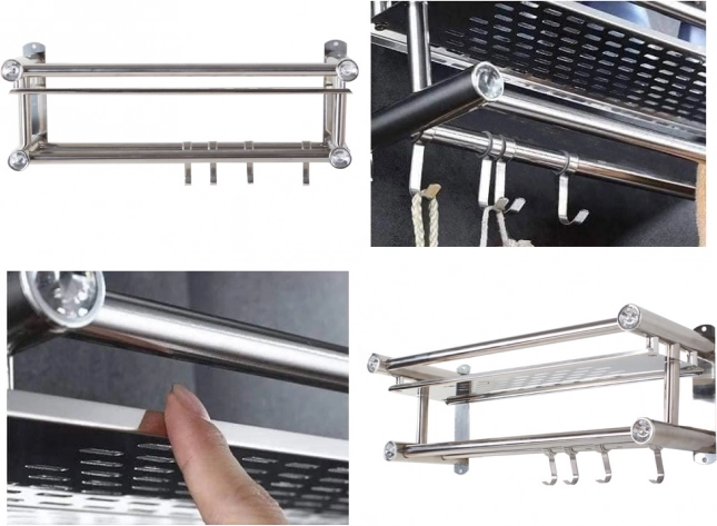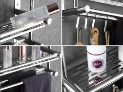 Táto nástenná kúpeľňová polica prináša chytré riešenie pre úsporu miesta aj poriadok v sprche či pri umývadle. Horná plocha pohodlne pojme kozmetiku a drobnosti, spodná časť ponúka dvojitú tyč na uteráky a štyri háčiky na doplnky. Minimalistické prevedenie v striebornej farbe pôsobí čisto a elegantne.