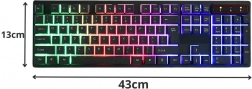 Táto herná klávesnica spája moderný dizajn a ergonómiu s praktickými funkciami na každodenné používanie. Plná veľkosť s numerickým blokom uľahčí prácu v tabuľkách aj hranie, zatiaľ čo tiché membránové spínače zaistia nerušenú prevádzku aj v neskorých hodinách. RGB podsvietenie dodá vášmu stolu výrazný vzhľad a možno ho jednoducho zapínať či vypínať klávesou Scroll Lock.