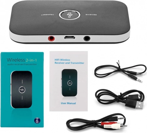 Bluetooth adaptér 2v1, AUX kábel, RCA kábel, Micro USB kábel, originálne balenie