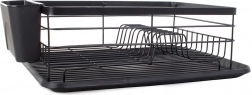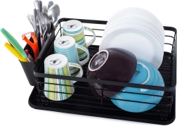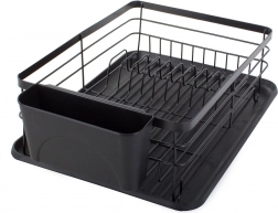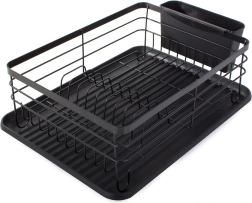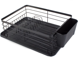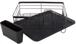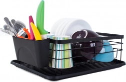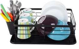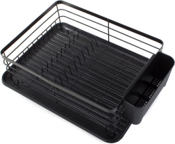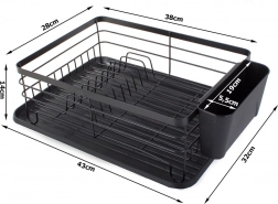 Praktický odkvapkávač na riad v elegantnej čiernej farbe pre poriadok na kuchynskej linke. Ponúka veľký objem, miesto pre 11 tanierov, samostatný organizér na príbor a plastovú odkvapkávačnú vaničku, ktorá chráni pracovnú dosku pred vodou. Odolná kovová konštrukcia s práškovou povrchovou úpravou zaisťuje dlhú životnosť a moderný vzhľad v loftovom štýle.