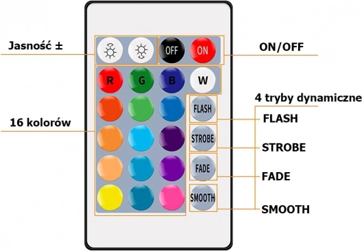 - 16 statických farieb, FLASH, krokové prechody 7 farieb, automatický režim, regulácia jasu, zap/vyp