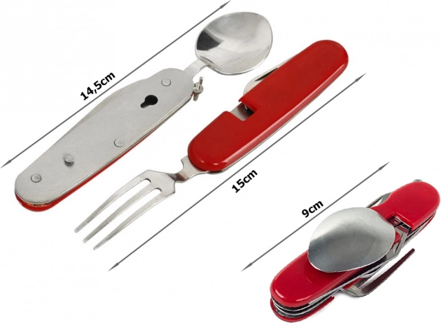 - Štyri nástroje v jednom - vidlička, lyžička, nôž a otvárač na fľaše