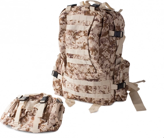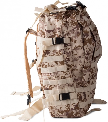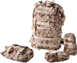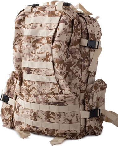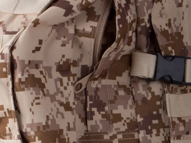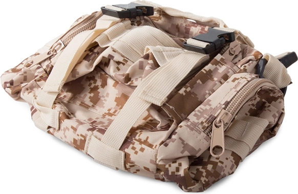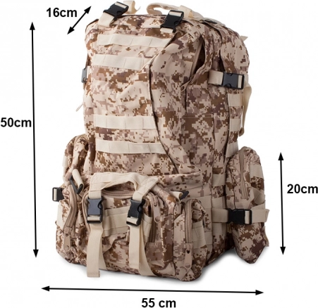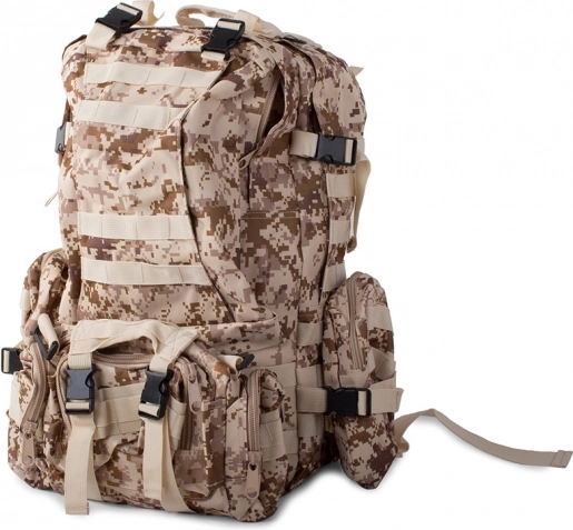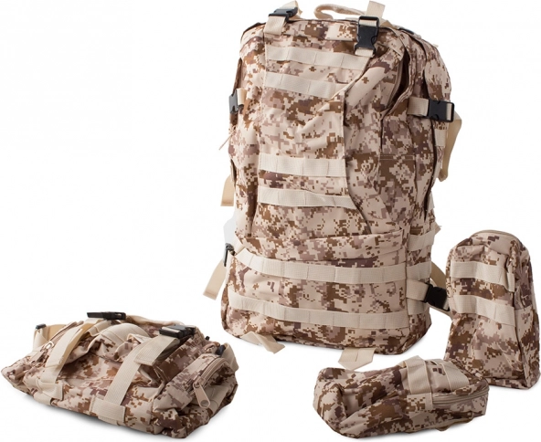 Vydajte sa na akúkoľvek výpravu bez starostí o počasie s nepremokavým taktickým batohom. Tento batoh ponúka jeden veľký hlavný oddiel s ďalšou priehradkou a sieťovými vreckami pre lepšiu organizáciu. Dve brašne na bokoch je možné jednoducho odpojiť, kým väčšiu ľadvinku môžete využiť ako samostatnú tašku. Batoh využíva systém MOLLE pre pridanie ďalších vreciek a modulov a vybavený je hrudným a bedrovým pásom pre maximálny komfort a stabilitu.