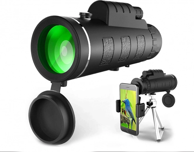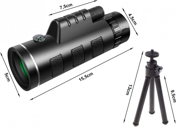 Kompaktný monokulárny ďalekohľad 40×60 so statívom a držiakom na telefón pre stabilné zábery a pohodlné pozorovanie. Ponúka veľký 40 mm objektív, protišmykové telo, dioptrickú korekciu a centrálne ostrenie. Skvelý na turistiku, kempovanie, pozorovanie zvierat aj športových podujatí.
