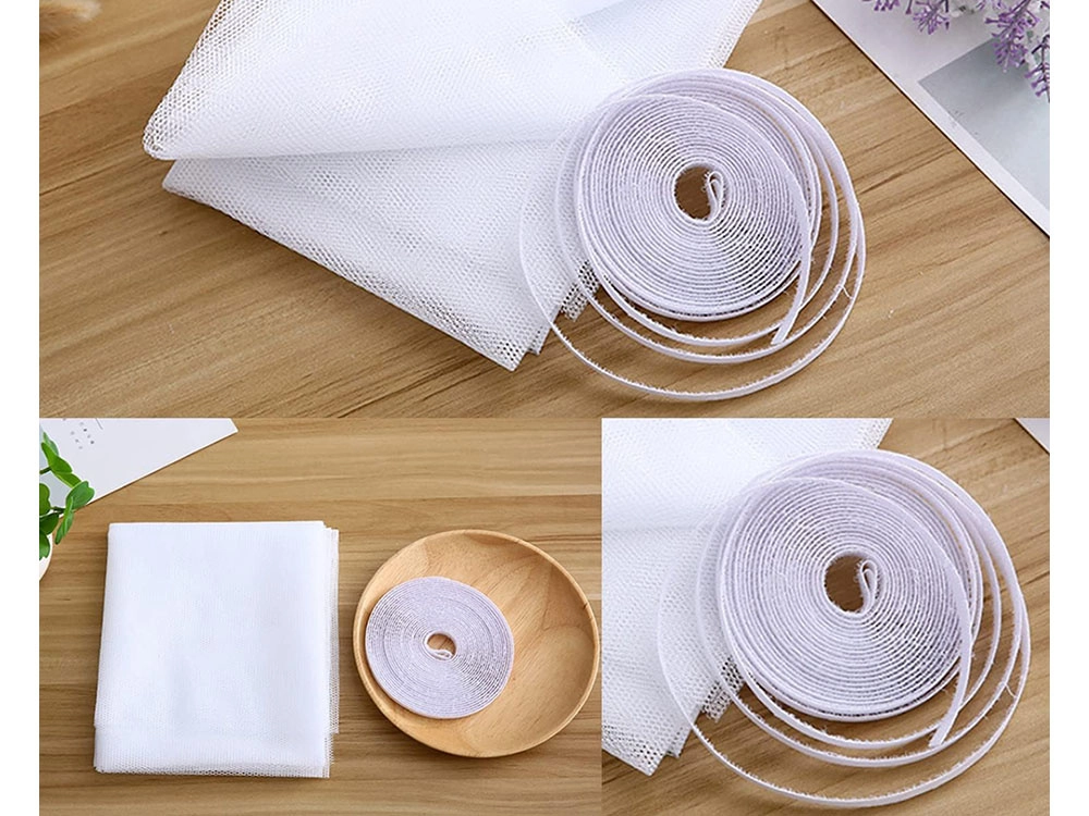 Inštalácia je otázkou niekoľkých minút: nalepte suchý zips na rám, priložte sieť, zastrihnite presahy a je hotovo. Materiál je odolný, prateľný (30 °C) a vhodný na opakované použitie. Rozmer 180 × 150 cm ľahko upravíte na mieru väčšine okien aj balkónových dverí.