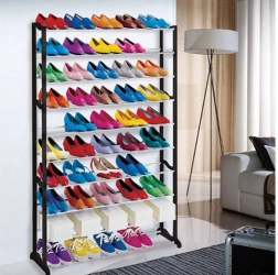 Konštrukcia kombinuje plastové stĺpiky a hliníkové trubky pre nízku hmotnosť, stabilitu a rýchlu montáž. Nastaviteľný počet úrovní 1–10 a rozstup políc 14 cm vám umožní prispôsobiť stojan teniskám, lodičkám aj detskej obuvi.