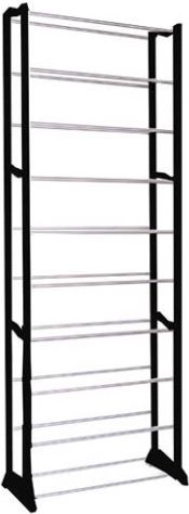 Usporiadajte svoju obuv rozumne a štýlovo. Tento viacposchodový stojan na topánky s 10 policami pojme až 50 párov, takže ľahko zvládne rodinnú zbierku aj sezónnu obuv. Čierny rám s chrómovanými priečkami zapadne do moderných interiérov a vďaka kompaktnej hĺbke 25 cm sa zmestí aj do užších priestorov.