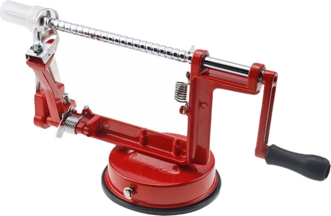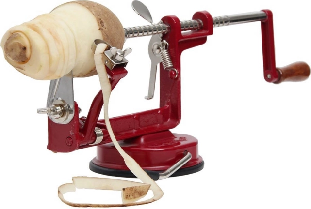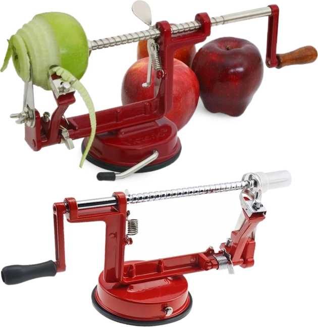 Tento oceľový škrabka na jablká 3 v 1 urýchli prípravu ovocia na pečenie aj každodenné občerstvenie. Vďaka ostrej nerezovej čepeli a plynulému nastaveniu ľahko ošúpete šupku, odstránite jadrovník a nakrájate jablko na špirálové plátky. Stabilná prísavka bezpečne prichytí prístroj k pracovnej doske.