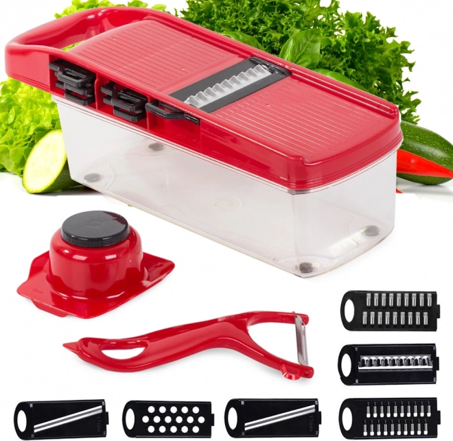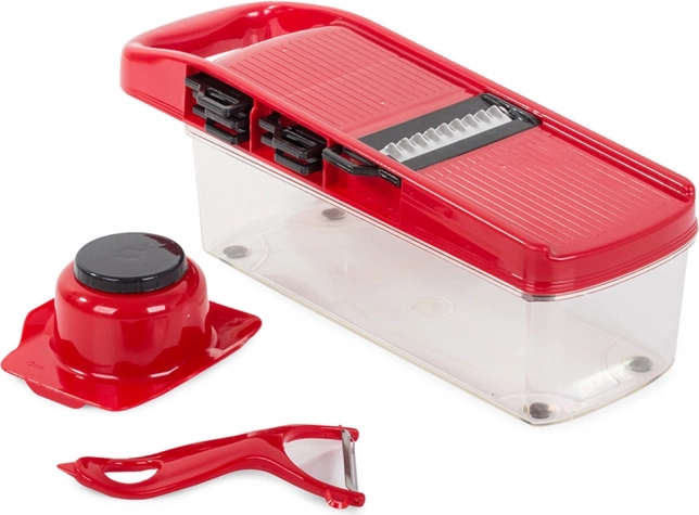 Sada obsahuje červenú plastovú nádobu s priehľadným dizajnom pre jednoduché sledovanie množstva nastrúhanej zeleniny. Ergonomickou rukoväťou si zaistíte pohodlný úchop a jednoduchú manipuláciu. Údržba je jednoduchá, stačí strúhadlo opláchnuť pod tečúcou vodou.