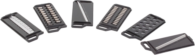 Sada obsahuje šesť rôznych čepelí pre všetky druhy krájania, vrátane tenkých a hrubých prúžkov, plátkov a vlnkového dizajnu.