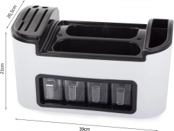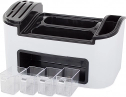Spodná časť organizéra obsahuje štyri priestranné zásuvky z estetického priehľadného plastu, ideálne na ukladanie kávy, čaju alebo cukru. Každá časť organizéra je ľahko odnímateľná pre dôkladné umytie a základňa funguje ako odkvapkávač na zaistenie sucha.