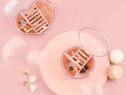 Kompaktná cestovná šperkovnica s okrúhlym tvarom a premysleným členením pre prstene, náušnice aj retiazky. Vďaka priehľadnému veku máte okamžitý prehľad, vyberateľný stred zjednodušuje organizáciu a pútko uľahčuje prenášanie. Ľahko sa čistí a skvele sa hodí na cesty aj domov.