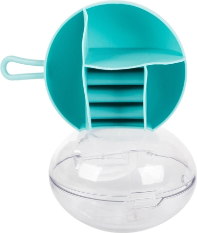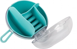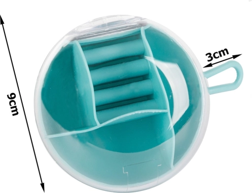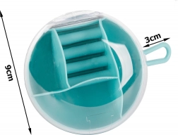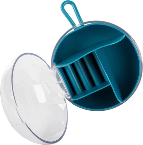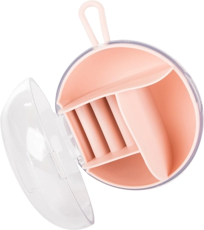 Vďaka vyberateľnému stredovému organizéru môžete časť priehradiek používať aj samostatne. Kompaktné rozmery priemer 9 cm a výška 6 cm z neho robia ideálnu voľbu do kabelky, kufra aj na toaletný stolík. Dostupné farby: ružová, tmavomodrá, zelená.