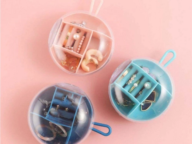 Táto elegantná cestovná šperkovnica pomôže udržať vaše cennosti v bezpečí a prehľadne usporiadané. Okrúhla krabička z odolného plastu má rôzne typy a veľkosti priehradiek vrátane držiakov na prstene, takže každý kúsok má svoje miesto. Priehľadné veko umožňuje rýchlu kontrolu obsahu bez otvárania a gumové pútko zabezpečí pohodlné nosenie.