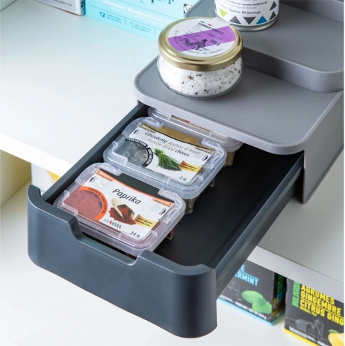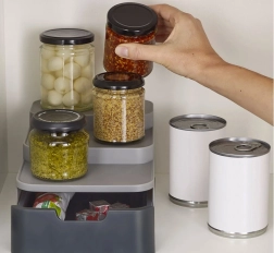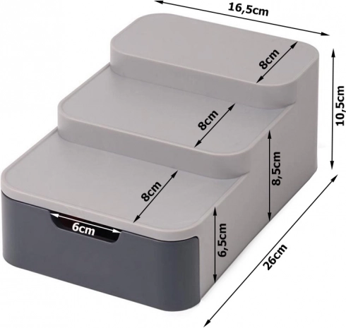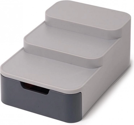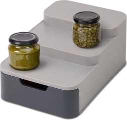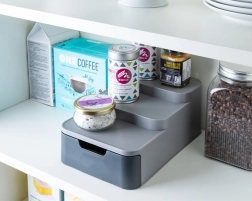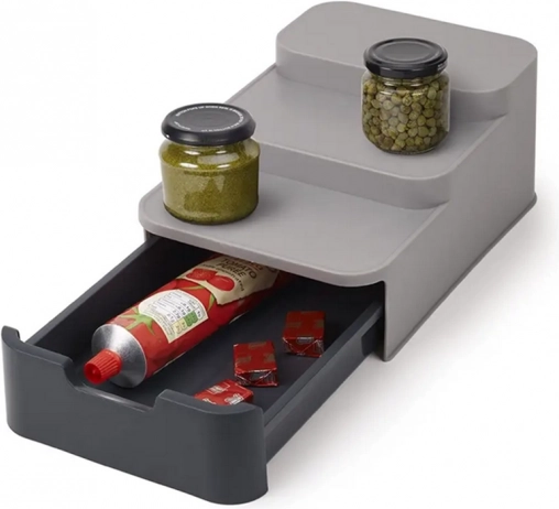 Tento kompaktný organizér efektívne využije priestor vo vašej špajzi či skrinke. Tri stupne zabezpečujú lepšiu viditeľnosť na poháre a plechovky v zadnom rade, zatiaľ čo výsuvná zásuvka pojme sáčky, tuby a ďalšie drobnosti. Odolný plast v sivej farbe sa ľahko čistí a skvele zapadne do modernej kuchyne.