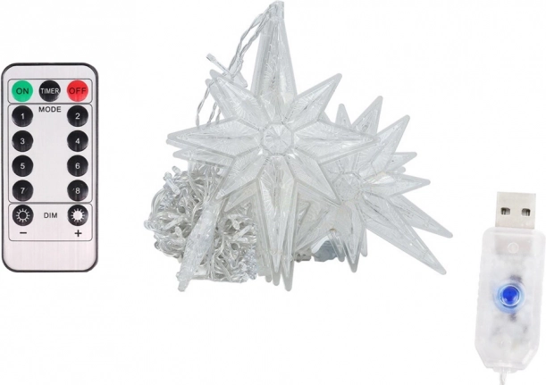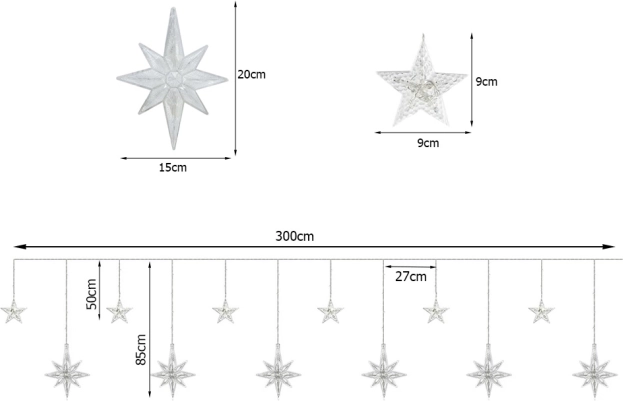 Záves obsahuje 6 veľkých hviezd a 6 menších hviezd, s celkovou dĺžkou 5 m. Môžete si vybrať z 8 rôznych svetelných programov pre vytvorenie požadovanej atmosféry pomocou dodaného diaľkového ovládania.