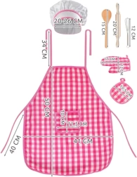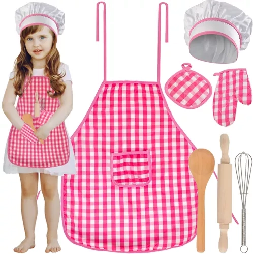 - Kompletná súprava: Zahŕňa 7 prvkov, ako sú zásterka, kuchárska čiapka, ochranná rukavica, podložka pod horúce nádoby, drevený valček, lyžica a kovová metla.