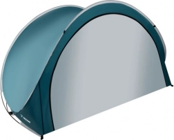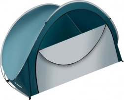 Dvojitý zips umožní vstup čiastočne či úplne uzavrieť, takže vo vnútri bezpečne uložíte veci bez piesku a prachu. Odolný polyester a stabilný sklolaminátový rám zabezpečujú spoľahlivosť pri vetre, v balení nechýba sada kolíkov, napínacie šnúry a puzdro na prenášanie.
