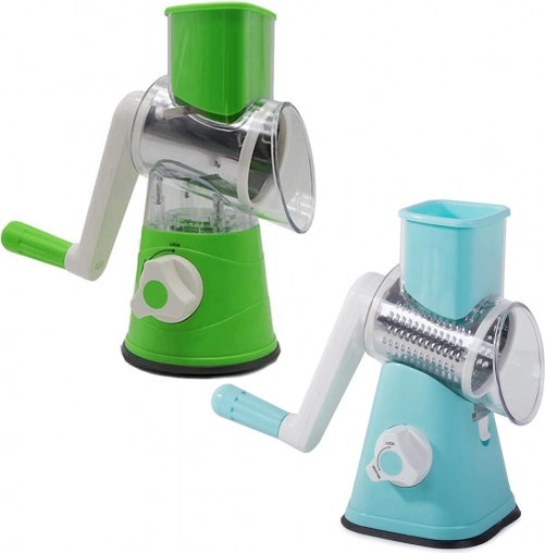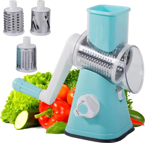 Tento krájač je veľmi ľahko použiteľný. Pripája sa špeciálnym gombíkom k pracovnej doske, stabilitu zaisťuje prísavka. Krájač je vybavený tromi vymeniteľnými bubnami, ktoré umožňujú rôzne druhy strúhania a krájania. Priložte kľučku k príslušnému bubnu a môžete ihneď začať krájať.