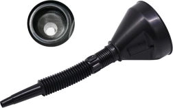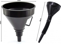 Veľký lievik s filtrom je vyrobený z plastových materiálov odolných voči chemikáliám, čo zaručuje dlhú životnosť a spoľahlivosť. Vďaka dvojdielnej konštrukcii možno použiť samostatne alebo v kombinácii s flexibilným nástavcom, ktorý uľahčuje presné nalievanie.