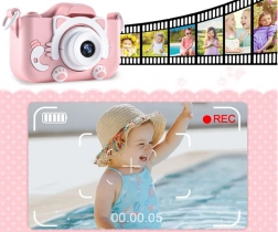 Fotoaparát má ružový dizajn v tvare mačičky s uškami a labkami, ktorý deti okamžite zaujme.